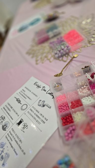Gemeinsam suchen wir die schönsten Farben und Formen aus. Ob Armband, Halskette oder ein kleines Geschenk für Mama, Papa oder die beste Freundin – jedes Kind entwirft sein ganz persönliches Schmuckstück. Süße Charms und besondere Perlen sorgen dabei für extra Glanz und ganz viel Freude.